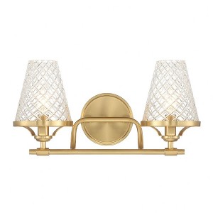 Collection: Candler, Material: Glass, Finish Color: Warm Brass, Width: 16.5", Height: 8.75", Depth: 7.5", Backplate Width: 5", Backplate Length: 5", Lamping Type: Incandescent, Number Of Bulbs: 2, Wattage: 60 Watts, Dimmable: Yes, Moisture Rating: Damp Rated, Desc: Infuse a bathroom with the vintage-inspired charm of the Candler 2-light bath bar from Savoy House. Two shades of tapered clear glass showcase a diamond pattern that adds texture, heightens the drama and recalls beautiful antique glassware. Warm Brass finish. Candler is 8.75" in height, 16.5" in width and extends 7.5" from the wall. Uses two candelabra size bulbs of up to 60 watts per bulb. Bulbs not included. This bath light is damp area rated and must be installed as shown.,