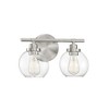 Adding the Savoy House Carson 2-light bath bar easily helps you boost the illumination and the style of any bathroom. Its fishbowl-style clear glass shades make a big statement and are open at the bottom, making it easy to replace the bulbs. The streamlined structure offers up subtle detailing with a mid-century modern vibe and the circular backplate echoes the shape of the glass shades. Finished in satin nickel. This fixture is 14" wide and 8.5" tall. It extends 7" from the wall. Uses 2 standard size bulbs of up to 60 watts each (not included).
