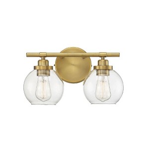 Adding the Savoy House Carson 2-light bath bar easily helps you boost the illumination and the style of any bathroom. Its fishbowl-style clear glass shades make a big statement and are open at the bottom, making it easy to replace the bulbs. The streamlined structure offers up subtle detailing with a mid-century modern vibe and the circular backplate echoes the shape of the glass shades. Finished in warm brass. This fixture is 14" wide and 8.5" tall. It extends 7" from the wall. Uses 2 standard size bulbs of up to 60 watts each (not included).