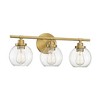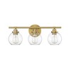 Adding the Savoy House Carson 3-light bath bar easily helps you boost the illumination and the style of any bathroom. Its fishbowl-style clear glass shades make a big statement and are open at the bottom, making it easy to replace the bulbs. The streamlined structure offers up subtle detailing with a mid-century modern vibe and the circular backplate echoes the shape of the glass shades. Finished in warm brass. This fixture is 22.5" wide and 8.5" tall. It extends 7" from the wall. Uses 3 standard size bulbs of up to 60 watts each (not included).