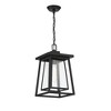 Boost your curb appeal and create a great first impression with the Craftsman-inspired style of the Savoy House Denver 1-light outdoor hanging lantern. Clear seedy glass and a matte black finish make Denver a great choice for lighting up today's fashionable homes. This fixture is 16.125" in height and 8" in width. It uses one standard size bulb with a max of 60 watts. Damp area rated. Comes with 120" of chain and 144" of cord.