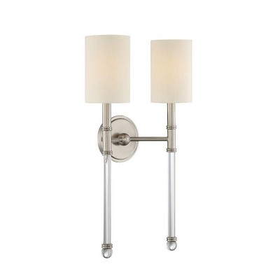 Slim and stylish! This Fremont sconce packs a whole lot of textural interest into a slender silhouette. The round wall plate and two light arms have double ring detailing and a deep, matte black finish. The long tails of those arms are made of clear glass, with a double ring of matte black above the glass ball finials. And the cylindrical shades are a lovely, soft white fabric. Altogether, it’s an elegant fixture that is a pleasure to have in your home. Two 60W, C-style bulbs fit within the shades of this 13” wide and 21” high sconce. It’s the perfect size to place alone or in pairs, along the walls of your dining room, kitchen, living room, entryway, bedroom, bathroom, office, family room, media room, or hallway.