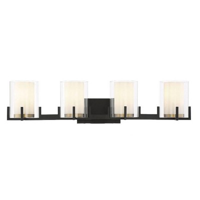 Take the glam factor of your bathroom up a notch with the Savoy House Garnet 4-light bath vanity light! Slats of faceted clear crystal add shimmer while the crystal tube detailing on the arms brings even more shine. Finished in polished nickel. Garnet is 9.50" in height, 32" in width and extends 7" from the wall. Uses 4 standard size bulbs of up to 60 watts per bulb (bulbs not included).