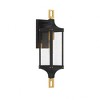Collection: Glendale, Material: Metal, Finish Color: Matte Black/Weathered Brushed Brass, Width: 5", Height: 20.5", Depth: 6", Backplate Width: 4.5", Backplate Length: 6.5", Lamping Type: Incandescent, Number Of Bulbs: 1, Wattage: 60 Watts, Dimmable: Yes, Moisture Rating: Wet Rated, Desc: Featuring a handsomely constructed look that recalls designer jewelry, the Savoy House Glendale 1-light outdoor wall lantern effortlessly emboldens any outdoor space. Buckle and screw detailing is finished in Weathered Brushed Brass to contrast beautifully with the Matte Black finish. Clear seeded glass adds texture and drama. Glendale is 20.5" in height, 5" in width and extends 6" from the wall. Uses one standard size bulb of up to 60 watts. The bulb is not included. Wet area rated.,