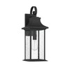 Create a stylish first impression outside your home with this Savoy House Hancock 1-light outdoor wall lantern. Crafted in a timeless classic style, it features a boldly sloped roof, shepherdï¾’s hook detailing and panes of clear seeded glass that ensures a beautiful, dramatic glow. A generously sized backplate helps to cover any holes left from replacing previous fixtures and the versatile black finish means that Hancock goes well with anything. Use this lantern beside your front and side doors or above your garage door. This fixture is 8.5" wide and 22.75" tall. It extends 9.25" from the wall. Uses one standard size light bulb of up to 60 watts (not included).