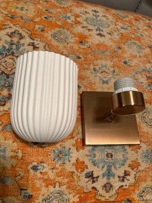 Collection: Isla Blanca, Material: Porcelain, Finish Color: Warm Brass, Width: 5", Height: 9", Depth: 6.5", Backplate Width: 5", Backplate Length: 5", Lamping Type: Incandescent, Number Of Bulbs: 1, Wattage: 60 Watts, Dimmable: Yes, Moisture Rating: Damp Rated, Desc: The Savoy House Isla Blanca 1-light sconce was designed by Breegan Jane, an award-winning interior designer and TV host. Breegan believes that luxe design is in the details, like the beautifully textured translucent porcelain shade that takes the spotlight here. When the light is on, the shade creates a flattering glow. When the light is off, it adds an eye-catching touch to any room. The Warm Brass finish amplifies the glamour. Isla Blanca is 9" in height, 5" in width and extends 6.5" from the wall. Uses one standard size bulb of up to 60 watts. The bulb is not included.,