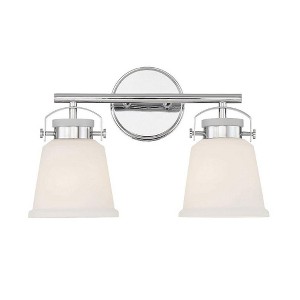 The Kaden 2-light bathroom vanity light from Savoy House has a classic look with a hint of industrial inspiration. White opal glass shades are held in place with eye-catching hardware that, like the bar and backplate, is finished in polished chrome. Kaden is 10.5" in height, 16" in width and extends 7" from the wall. It uses two standard size bulbs with a max of 60 watts per bulb. Damp area rated.