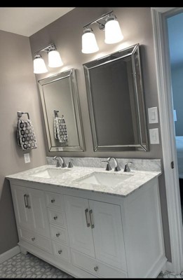 Lights and mirrors are from Lamps Plus. They are over a 60" vanity and I could not be any happier on how they look.