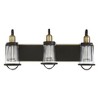 Industrial-inspired design, like this Lansing bath bar, brings a solid, practical, and vintage aesthetic to your home. The classic style is an excellent fit with industrial chic, modern farmhouse, urban loft, transitional, and eclectic decor. This bath bar features a sturdy rectangular wall plate, curved light arms, and cage-like details on the shade. And the entire frame has a beautiful, dark, English bronze finish with bright, warm brass accents. The slim tapered shades are made of clean, clear glass, allowing the light from three 60W, E-style bulbs to shine above your vanity. This fixture is 24” wide, 10” high, and extends 7” from the wall. It’s an impeccable choice for vintage industrial elegance in your bathroom or powder room.
