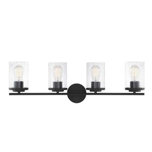 Illuminate your vanity mirror beautifully with this Savoy House Marshall 4-light bath bar. Its classic Americana look fits in perfectly with a wide variety of decor styles. The hurricane-style shades of clear seeded glass add a boost of drama and intrigue and the circular backplate brings in another dimension of thoughtful detailing. Finished in matte black. This fixture is 31" wide and 9.5" tall. It extends 6.5" from the wall. Uses 4 standard size bulbs of up to 60 watts each (not included).