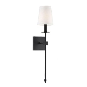 This Savoy House Monroe 1-light sconce features a long sleek body, a white fabric shade and a classy, contemporary silhouette. matte black finish. Sconces add a touch of style and light to any wall, including but certainly not limited to hallways, entryways, stairways, great rooms and dining rooms. You will also often see a pair of sconces flanking a bathroom vanity mirror to provide an even, flattering wash of light. Bulb not included. The matte black finish can be paired with black hardware or mixed with hardware in other finishes. Monroe is a perfect addition to rooms of any style, especially transitional or classic. When you choose a Savoy House lighting fixture, you can be certain you’ve selected a piece that will withstand the test of time.