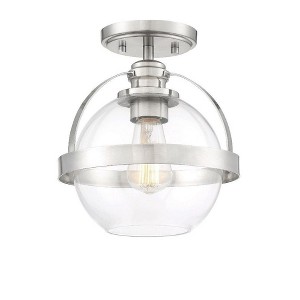 This Savoy House Pendleton 1-light ceiling semi-flush mount is a smart way to pep up the illumination and style in any room, including small spaces that might otherwise have lackluster light. It showcases a large orb of clear glass that is open at the bottom, allowing for more direct light and making it easy to replace the bulb. Metal bands bisect the shade and help hold it to the fixtureï¾’s base. Try using this fixture in laundry rooms, closets, hallways or entryways, though truly the possibilities are endless. Finished in satin nickel. This fixture is 9.38" wide and 9.75" tall. Uses a standard size bulb of up to 60 watts (not included).