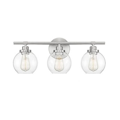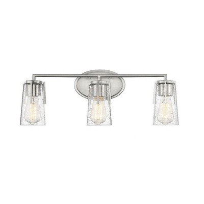 A clean, streamlined design with clear seeded glass shades defines the Sacremento Collection. Measuring 14" wide x 8 ½" high x 5 3/8" extension, this two-light bath bar in a satin nickel finish provides ample illumination from two 60-watt Edison-base bulbs. Material: Metal, Finish Color: Satin Nickel, Width: 14", Height: 8.5", Depth: 5.38", Backplate Width: 8", Backplate Length: 5", Lamping Type: Incandescent, Number Of Bulbs: 2, Wattage: 60 Watts, Dimmable: Yes, Moisture Rating: Damp Rated