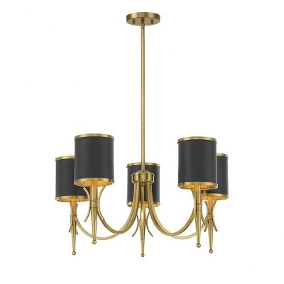 The Savoy House Tivoli 6-light chandelier has a whimsical yet glamorous look that is truly perfect for today's homes. Three adjustable arms each hold two lights topped with white fabric shades and decorated with faceted crystal baubles. Finished in a beautiful two-tone matte black with warm brass accents. Tivoli is 28" in diameter and has an adjustable height ranging from 20" to 74". It uses six candelabra size bulbs of up to 60 watts per bulb. Comes with four 12" downrods and one 6" downrod, plus 80" of cord.