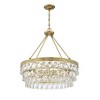 The Windham is a glamorous, modern pendant that brings a touch of luxury and elegance to your home. The wide, textured hoop of the frame, downrods, and disc-shaped canopy have a golden and bright, warm brass finish. This circular frame holds three descending tiers of gorgeous clear crystals. The alternating oval and teardrop shapes of the crystals add wonderful texture and sparkle. Six 60W, C-style bulbs within, provide beautiful illumination —overall a stunning choice for your glam, contemporary, or transitional decor style. The pendant is 28” wide and 28” high: a perfect fit for your dining area, living room, foyer, great room, bedroom, stairway, kitchen, or family room.