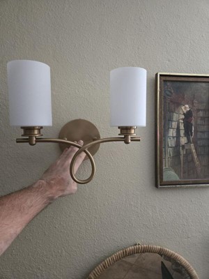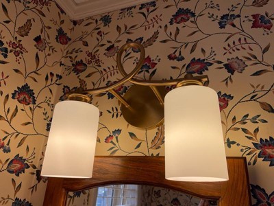 A graceful scroll flourish distinguishes the Woodbury Collection of bath bars. Measuring 14" wide x 12" high x 7" extension, this two-light bath bar in a versatile pairing of a warm brass finish with white glass provides ample illumination from two 60-watt Edison-base bulbs. Material: Glass, Finish Color: Warm Brass, Width: 14", Height: 12", Depth: 7", Backplate Width: 1", Backplate Length: 5.5", Lamping Type: Incandescent, Number Of Bulbs: 2, Wattage: 60 Watts, Dimmable: Yes, Moisture Rating: Damp Rated