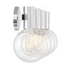 This Savoy House Wright 4-light bath vanity light showcases streamlined style that makes it ideal for any bathroom. Round clear glass shades add an extra dimension and extra protection for the light bulbs within. Chrome finish. Wright is 34" in width, 10" in height and extends 7.5" from the wall. Uses 4 standard size bulbs of up to 60 watts per bulb (bulbs not included). We recommend using tubular shaped bulbs.