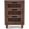 Create a unique, minimalist-style feel with this mid-century modern cabinet. Solidly constructed, this three-drawer cabinet features an ash wood frame and legs making it sturdy while also adding to its stylish appeal. The vertical lines on the cabinet drawers offer the perfect balance of an aesthetically pleasing design and minimalist simplicity. Sticking with the clean and simple theme, this cabinet helps you keep your home tidy by providing a functional storage area. Place the cabinet in your living room as an end table, bedside as a nightstand, or use a bathroom storage cabinet. It features a walnut finish with quality veneers that bring out the natural beauty of the wood. This functional cabinet is ideal for mid-century, modern, minimalist style rooms.
