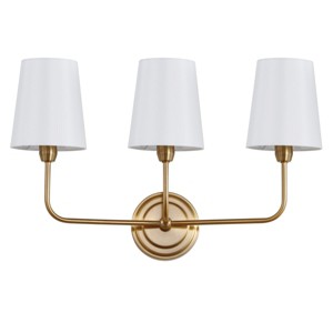 Illuminate your space with the elegant Sawyer wall sconce. Measuring 21.5 inches, this exquisite piece adds a touch of sophistication and charm to any room. The three-light design ensures ample light coverage, creating a warm and inviting atmosphere. Crafted with a metal brass finish, the Sawyer wall sconce boasts a rich and stylish appearance that complements a variety of decor styles.