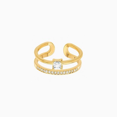 Looking for a classic combination of wedding band and engagement ring in one? Meet our Saya Double Band Ring. This exclusive article features a dual-band setting, with the lower layer replicating a wedding band’s design and the top band replicating an engagement ring. The lower band also features a dazzling stud in the center while the top layer displays a row of tiny crystals.