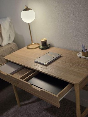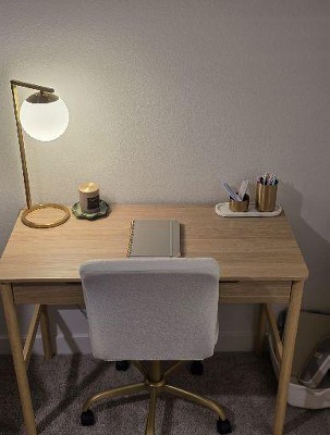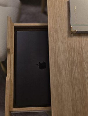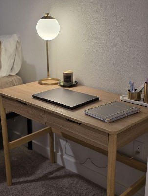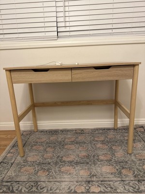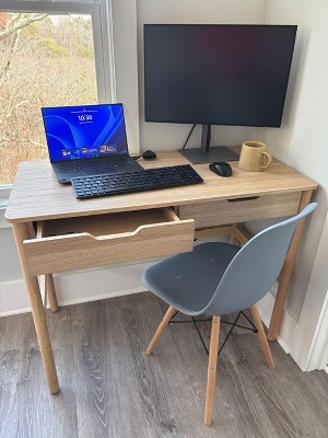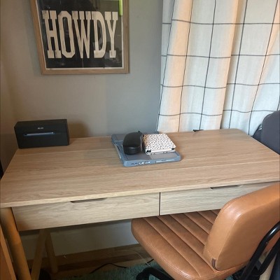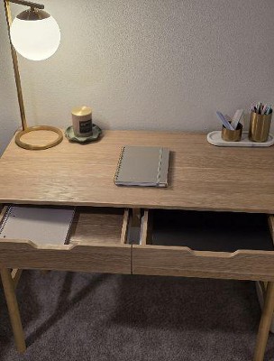 A: The desk features two pull-out drawers for convenient storage of office supplies.