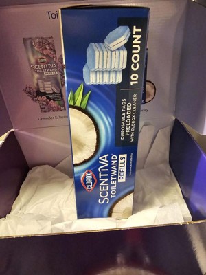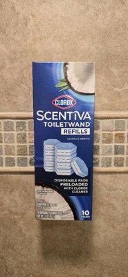 Clorox Scentiva ToiletWand Refills combine the trusted cleaning of Clorox with the refreshing scent of Coconut and Waterlily for an elevated cleaning experience. Clorox Scentiva scents are well crafted, curated and inviting blends that make a sophisticated addition to your cleaning products. Each disposable scrubbing pad is preloaded with Clorox Cleaner that powers through hard water and lime stains 2X faster than when using a toilet brush with manual toilet bowl cleaner. Designed for optimal reach, hexagonal shaped scrubbing pads conform to hard to reach areas like under the rim. The beachy scent neutralizes odors without the bleach smell. Use this non abrasive formula to clean a variety of surfaces, including porcelain, chrome, enamel and synthetic marble. Never touch an icky toilet brush again: disposable scrubbing pads conveniently pop off into the trash so you can toss the mess every time. Designed for use with the Clorox ToiletWand handle (sold separately). USAGE DIRECTIONS: To Clean: Open pouch of disposable cleaning heads and push handle straight down onto cleaning head unit until it clicks into place. Empty bowl before cleaning. Dip cleaning head in toilet bowl water for 1 to 2 seconds. Scrub entire toilet bowl above water line. When finished, release excess water by pressing cleaning head against toilet bowl and slide blue button forward to release head into trash bin. Flush to rinse toilet. Do not flush cleaning head. CAUTION STATEMENTS: CAUTION: EYE IRRITANT. Avoid contact with eyes. FIRST AID: EYES: Immediately rinse with water for 15 minutes. If irritation persists, call a doctor. KEEP OUT OF REACH OF CHILDREN AND PETS.