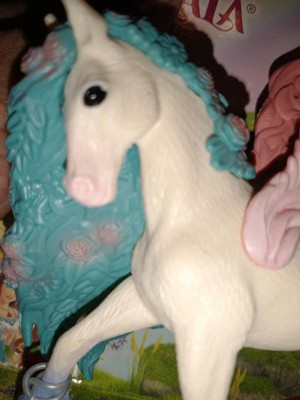 [This review was collected as part of a promotion.] My daughter LOVES this pegasus toy! First of all, it's beautiful! The colors are vibrant and the design from the horn to the wings to the tail is very intricate and whimsical. It's a plastic but it's soft and moveable and heavy. It's a great, impressive toy and has become a staple in my daughter's fairy doll house.