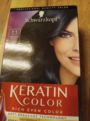 Schwarzkopf Keratin Color Permanent Hair Dye Color Cream, 1.1 Midnight Black - Professionally-inspired hair color for women. This permanent hair dye provides rich, striking color on all hair textures - with minimal damage*. The Keratin hair color formula was developed with professionals to provide professional-quality hair color and brilliant shine. In addition, our 3-step Bond Enforcing System creates bonds and strengthens your hair, leaving your hair 5x stronger** after coloring. Keratin Color also reduces frizz by providing humidity resistance for 72 hours.*** Our pre-color serum containing Vitamin B6 and Collagen, primes the hair. We recommend repeating the application of the hair dye in tube every 4 weeks for even color from root to tip. Established in 1898, Schwarzkopf has 125+ years of hair expertise, providing professionally-inspired hair color at home. The product benefits at a glance: