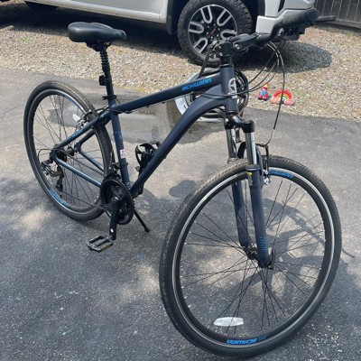 Lead the way on the 700c Men's Trailway by Schwinn, a road-ready hybrid bike that's versatile enough to meet all your riding needs. Thanks to the light alloy hybrid frame and 21-speed trigger shifters, the Trailway is speedy and agile for morning commutes. But don't be fooled. With the help of a powerful front suspension fork to soak up bumps, alloy linear pull brakes and light yet strong aluminum double wall rims, this hybrid will breeze through gravelly weekend romps too. Throw in a reliable suspension seat post, a cozy Schwinn hybrid seat, and ergonomic handlebar grips, and the ride is always comfortable and smooth. The Trailway comes with a limited lifetime warranty for as long as you own the bike. Enjoy the freedom of riding a Schwinn!