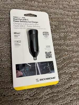 [This review was collected as part of a promotion.] This super convenient portable in-car charger is for use with your vehicle's direct current (DC) auxiliary power outlet/12V accessory outlet. It's a single device that supports a 30W-charge for 2 devices independently for super fast charging! I definitely appreciate that no compatibility error messages result and the charge symbol is always displayed to confirm the active charging on all of my USB-C devices! Full Product Name: Scosche PowerVolt PD60 Dual-Port USB-C Power Delivery Car Charger