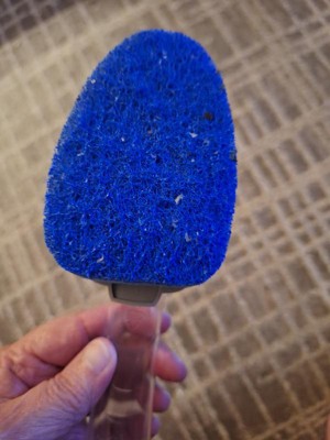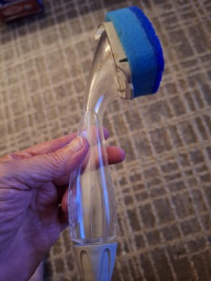 - When it is time to change the head, hold the dishwand with head facing up. Push tab away from handle, slide refill off and push forward to remove. Slide new head onto handle and click into place