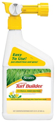 Scotts® Liquid Turf Builder® with Plus 2 Weed Control kills listed weeds, all while giving your lawn a quick boost of nitrogen. This combination weed killer and fertilizer controls common lawn weeds including dandelions, clover, buckhorn, chickweed, ground ivy, henbit, knotweed, lambsquarters, oxalis, pigweed, plantain, poison ivy, ragweed, spurge, and more as listed. Apply Scotts® Liquid Turf Builder® with Plus 2 Weed Control when weeds are actively growing. Simply connect the container to a garden hose, turn on water, and spray. This product is for use on grass lawns only, do not use on or around shrubs, trees, or ornamental plantings. Do not water the treated area for 48 hours after application, as this will wash off the weed killing material. Weeds will begin to curl within a few days. Some hard-to-control weeds may require a repeat application in 3 to 4 weeks. One 32 fl. oz. container of Scotts® Liquid Turf Builder® with Plus 2 Weed Control provides coverage of 6,000 sq. ft. for warm season lawns and 4,000 sq. ft. for cool season lawns.
