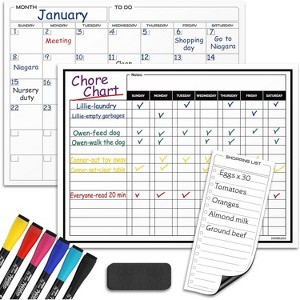 Stay organized at home with the Magnetic Chore Chart Set. This 3-piece organizer bundle includes a 13"x17" behavior reward chart to help kids stay motivated, a monthly magnetic dry erase calendar to track family schedules, and a magnetic shopping list board for groceries and reminders. Each board features a smooth, stain-resistant surface that erases cleanly for reuse. With 6 included colorful dry erase markers and a convenient eraser, it’s easy to keep chores, appointments, and lists neat and visible. Perfect for families, classrooms, or home offices, this set combines structure and convenience to make planning effortless. Organize your family or tasks with this 11”x17” magnetic chore chart. Includes a monthly planner and six dry erase markers for easy use. Ideal for home, office, or gym routines. Great gift for teachers and families. Ensure your fridge supports magnets before purchasing.