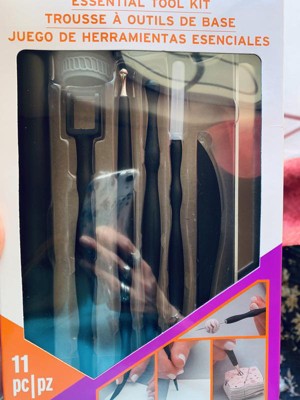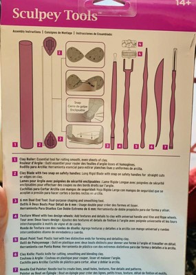 POLYFORM-Sculpey Essential Tool Kit. This tool kit contains eleven must-have tools for anyone looking to work with clay. This kit contains one acrylic clay roller, one super slicer blade with two safety handles, one 6mm style and detail tool, one texture wheel handle with two interchangeable wheels, one blunt point and ball end tool, one knife end, flat end tool, and one needle end/circle end tool. Clean tools with soap and water. Caution: points and blades are extremely sharp. Handle with care. Imported.