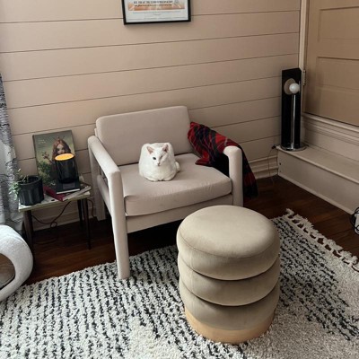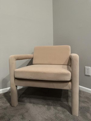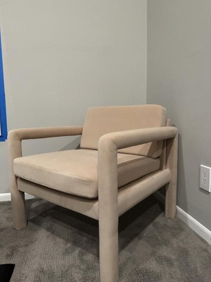 The chair is so pretty, and fits perfectly in my office. Was very simple to assemble. It’s a bit on the firm side but nothing a throw pillow won’t help. Within 10 min of assembly the cat was sitting on giving his approval. I also got the ottoman from target threshold, it’s a warm fawn color that looks perfect with the chair!