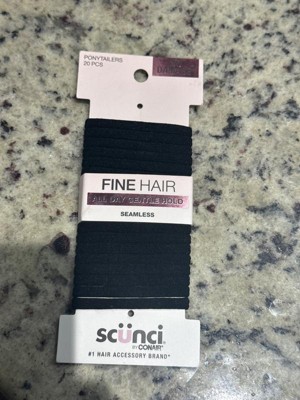 [This review was collected as part of a promotion.] Scunci Fine Hair Black Hosiery Hair Ties 20pk - No Damage. They don't pull out your hair. They work great, hold in place, and I recommend for all your up do needs.