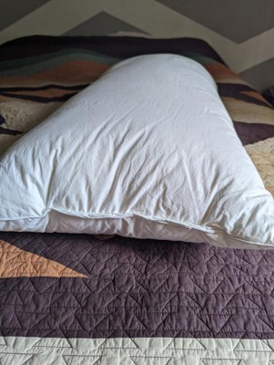 [This review was collected as part of a promotion.] This is a super soft and extra large pillow. I love down pillows and comforters but always worry about the feathers poking their way out. This is really well made and there are no issues with the quills. It doesn't get overly hot, nor does it flatten out with use. I wish the storage bag wasn't open to dust, but that is not a big deal unless you plan to store it for periods.