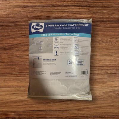 Bring stain fighting technology and cozy comfort to baby’s bed with the Sealy Stain Release Waterproof Crib Mattress Pad. The stain release finish allows stains to easily wash away to create a fresh, clean sleeping surface for your little one. The cotton-blend knit top is cozy for infants and toddlers, while the hypoallergenic quilted fill - made from recycled plastic bottles - provides cushioned comfort. This crib mattress protector pad features a waterproof barrier for protection from moisture, spills, and diaper leaks and is machine washable and dryer friendly for easy cleaning. For a safe, snug fit, this mattress pad features a full fitted 8.5" long SecureStay skirt that stretches to wrap well underneath full-size crib and toddler bed mattresses for safety and security. The Sealy Stain Release Waterproof Crib Mattress Pad measures 52” x 28” and is designed to fit USA standard full-size crib and toddler mattresses. An ideal baby registry and baby shower item, new parents should register for 2-4 crib pads, so baby’s bedding is fresh while the other pads are in the wash.