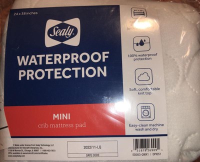 The Sealy Waterproof Protection Fitted Mini Crib Mattress Pad keeps baby’s mini crib mattress fresh, comfy, and well protected. A premium waterproof barrier offers protection from leaks, spills, and moisture for easy cleaning. The soft, knit top is comfortable for infants and toddlers, while the quilted cushioning keeps your little one cozy. Plus, the hypoallergenic fill is made from recycled plastic bottles for a greener crib pad in baby’s sleeping area. Sized at 38 inches x 24 inches, this crib pad is designed to fit mini crib mattresses with a depth of 2-5 inches. The deep pocketed Secure Stay skirt stretches to wrap snuggly under baby’s mattress, and an elastic edge helps prevent sliding, shifting, and bunching for added security. This machine washable and dryer friendly pad has been extensively safety, quality, and durability tested.