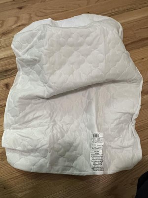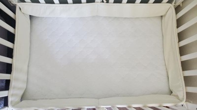 I got this matress protector for my mini crib. Its soft and the top is made of knit fabric, not plastic, so it does not make any sounds when baby moves around. It is also filled with hypoallergenic material that was recycled. The cover is washable and big enough to go around thick mattress.