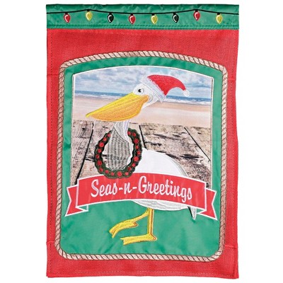 Decorate for the holidays with this festive outdoor garden flag with the sentiment "Seas & Greetings " written on it; Featuring a beautiful mermaid sitting in a sea shell surrounded by starfish and Christmas lights. Flag is made of double applique polyester and Burlap fabric material; Fabric is weather resistant and embroidered with attention to detail. Outdoor flag measures approximately 13 x 19 inches; Fits on most standard garden poles (sold separately). Designed with 3-ply construction: two applique panels, sewn back to back, with batting between; Craftsmanship yields a rich looking and high appearance. Contained in protective packaging; Ready for gifting