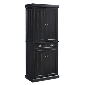 Crosley Seaside Kitchen Pantry Distressed Black: Traditional Style, 4-Door Hutch, 6 Shelves, Wood Veneer