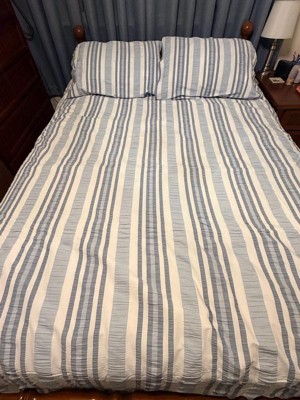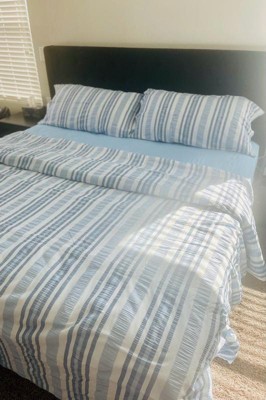 [This review was collected as part of a promotion.] I absolutely love my new Seaside Stripes 3 Piece Comforter Set! The pale blue stripes are so pretty and feel very coastal. The comforter is so warm and cozy on my bed. The quality is top notch! It is a nice fit on my Queen sized bed. The pillow shams match nicely. I received a free set in exchange for my honest review.