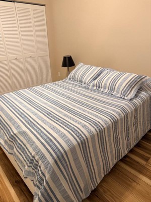 - THE BEACH DAYS DESIGN: One of our most popular sets, Seaside Stripes is breezy and timeless. The front is a seersucker nautical stripe and the reverse is solid blue. Button closures at the bottom of the duvet cover are durable and easy to use.