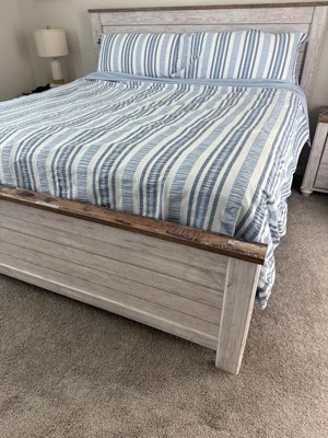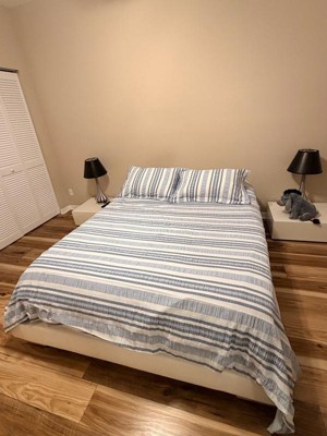 [This review was collected as part of a promotion.] I just put the Levtex Home Seaside Stripes Duvet Set on my son’s bed, and it looks fantastic! One side is smooth, while the other has the textured stripe pattern as shown in the photos – it feels fresh, stylish, and breezy. The fabric is soft and pleasant, and after 3 washes it keeps its shape perfectly and doesn’t roll up. My child has allergies, and this fabric didn’t cause any discomfort at all. The fabric is lightweight, and the set comes packed in a little bag, which makes it easy to store. Machine washable and including the duvet and two king pillowcases, this set is as practical as it is beautiful. Really happy with it!