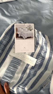 [This review was collected as part of a promotion.] I just put the Levtex Home Seaside Stripes Duvet Set on my son’s bed, and it looks fantastic! One side is smooth, while the other has the textured stripe pattern as shown in the photos – it feels fresh, stylish, and breezy. The fabric is soft and pleasant, and after 3 washes it keeps its shape perfectly and doesn’t roll up. My child has allergies, and this fabric didn’t cause any discomfort at all. The fabric is lightweight, and the set comes packed in a little bag, which makes it easy to store. Machine washable and including the duvet and two king pillowcases, this set is as practical as it is beautiful. Really happy with it!