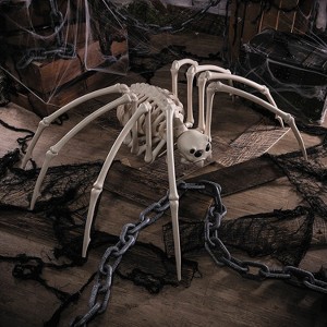 A scary skeleton spider decorative prop for Halloween. Made of durable plastic and vinyl, this 40.5 x 24.5 x 12.75 inch prop features expandable legs and a hanging tag for easy display. Perfect for indoor Halloween décor. Care Instructions: Hand wash cold water with mild soap. Tumble dry low. For best results hang or lay flat to dry.