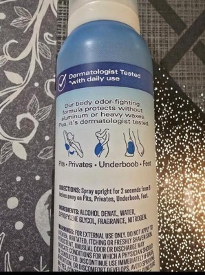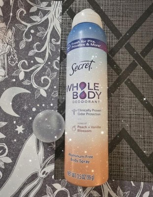 [This review was collected as part of a promotion.] I received this product in exchange for my honest review & feedback. SECRET Aluminum Free Whole Body Spray Peach & Vanilla Deodorant is the most refreshing deodorant spray I've ever tried. It instantly cools skin and provides 72 hours of odor protection from your arm pits to your toes. This spray goes on clear and leaves no white residue. PH balancing minerals in this spray are gentle on skin and aluminum & dye free. The peach and vanilla scent is light & lovely and pairs well with my perfume.