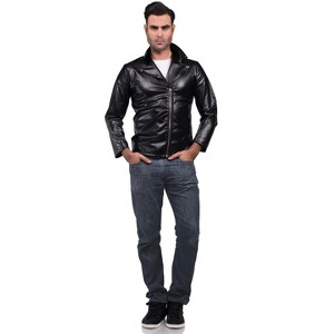 Step into retro cool with our Men's Greaser Jacket, a bold statement piece that embodies the rebellious spirit of 1950s Americana. Crafted from sleek black faux leather, this jacket captures the essence of classic greaser style with its iconic zippered front and rugged yet refined silhouette. Featuring a sharp collar and faux collar buttons, it exudes effortless swagger and timeless appeal, perfect for those who appreciate vintage-inspired fashion with a modern edge. Whether you're revving up your motorcycle or hitting the town with friends, this jacket ensures you command attention with every step. Its sturdy construction ensures both comfort and durability, making it a versatile choice for nights out, themed parties, or adding a touch of retro flair to everyday attire. Embrace the nostalgia of an era defined by rock 'n' roll and rebellion with our Men's Greaser Jacket, where timeless style meets undeniable attitude for the modern-day gentleman with a penchant for classic Americana.