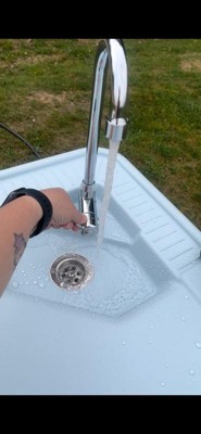 [This review was collected as part of a promotion.] This is a fantastic outdoor sink to use around the house. I've used it several times and so far it's amazing. It's taller than a typical countertop height table. It assembled easily, which I did myself in about 10 minutes. The faucet swings 360 degrees. I used a heavy-duty water hose. The clean up is easy. The shelving on the bottom is a terrific edition. The table is incredibly sturdy and folds up nicely. The sink fills easily and drains with the hose! The only negative are hose connections, which aren't particularly high quality. But I highly recommend it!